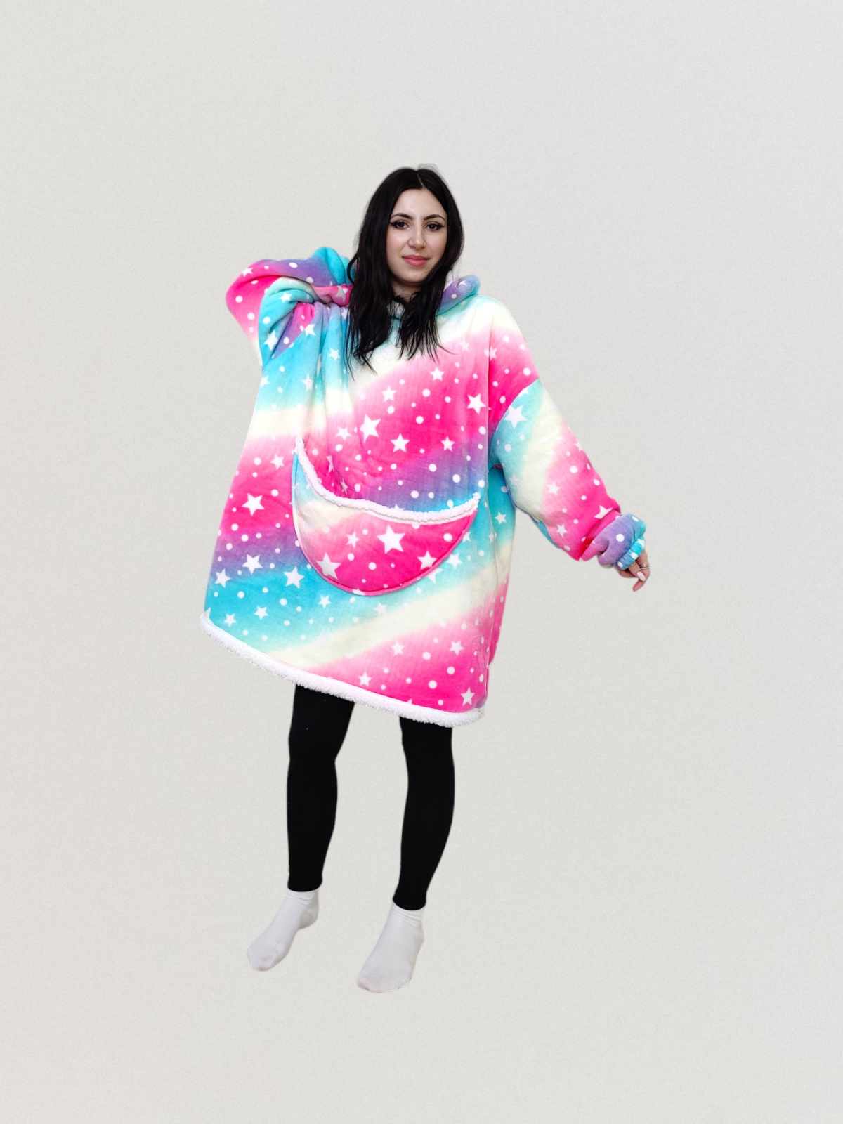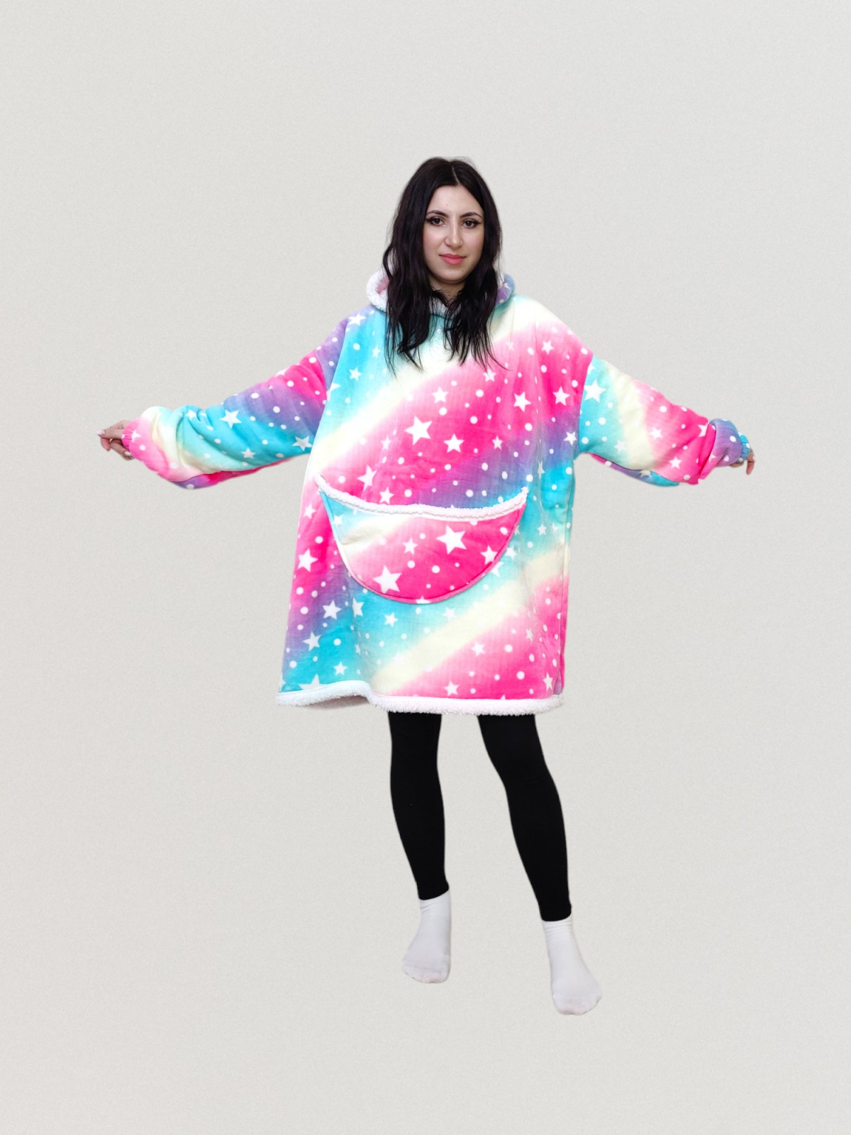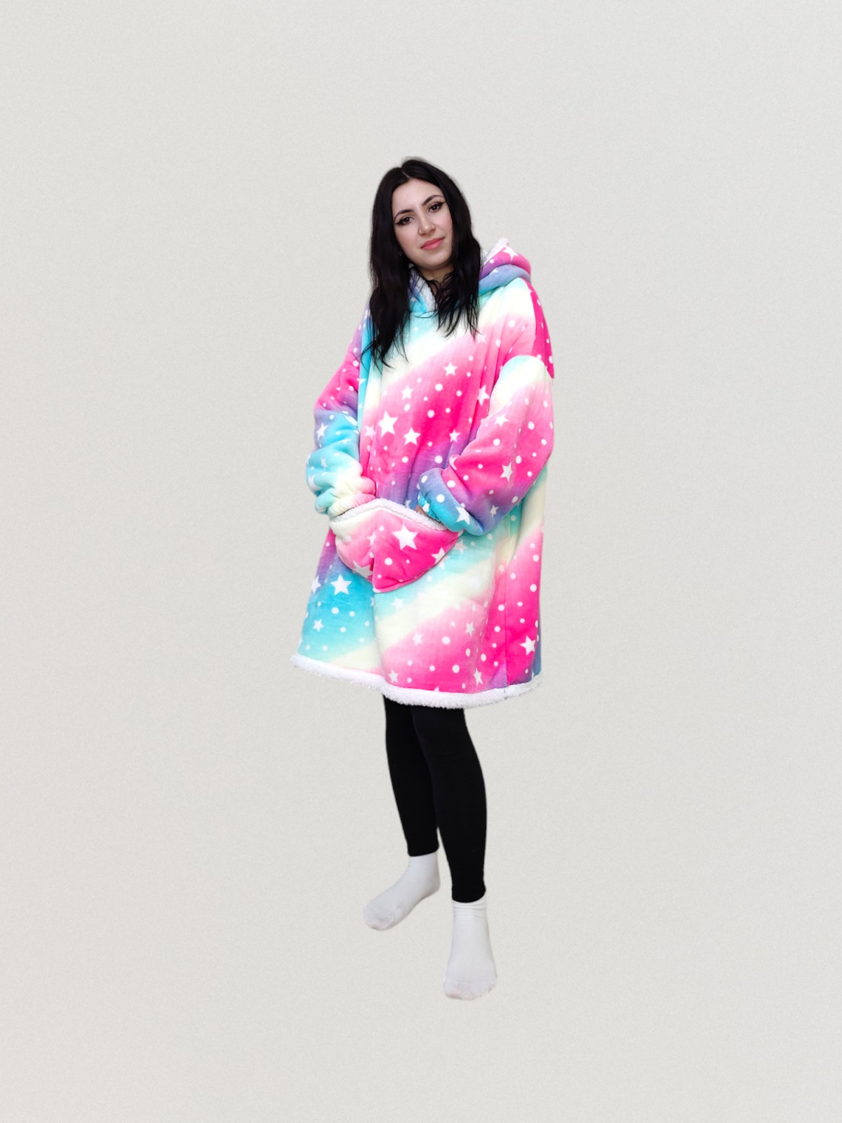 Hanoracul Veselia este o explozie de culoare si confort, confectionat dintr-un material moale de tip flannel fleece care promite sa te invaluie in caldura si buna dispozitie. Cu o lungime generoasa de 90 de centimetri si o latime de 75 de centimetri, acest hanorac oversize este perfect pentru a te cuibari in zilele reci sau pentru a adauga un strop de magie momentelor de relaxare.